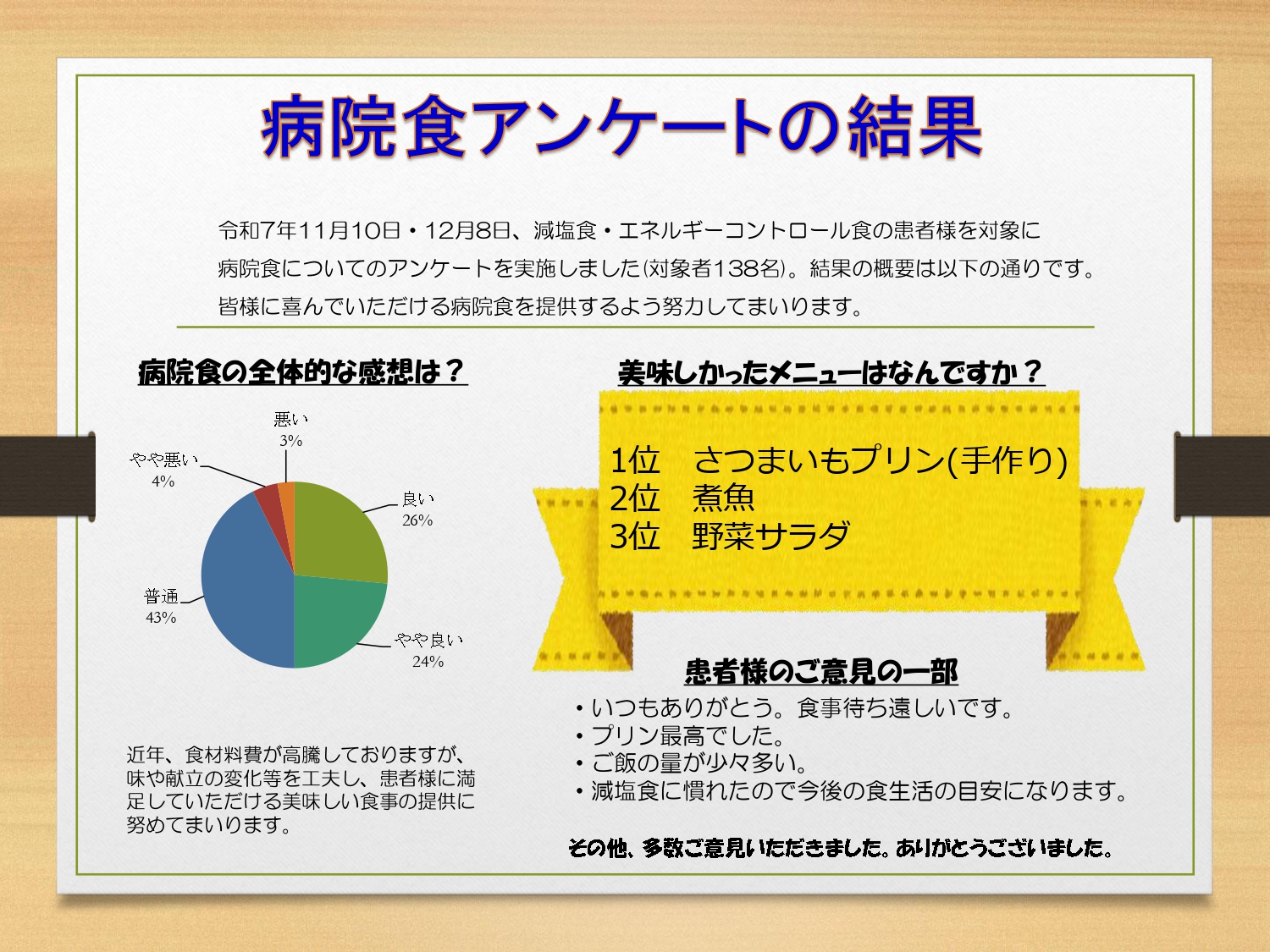 病院食アンケートの結果令和7年11月19日、令和7年12月8日、減塩食・エネルギーコントロール食の患者様を対象に、病院食についてのアンケートを実施しました。(対象数138名)